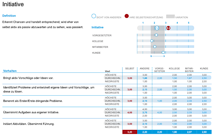 Das Selbstbild der Feedbacknehmer und das Fremdbild der Beurteilergruppen werden systematisch abgeglichen. Mitarbeiter und Führungskräfte erhalten so ein individuelles Feedback hinsichtlich ihrer persönlichen Kompetenzen.